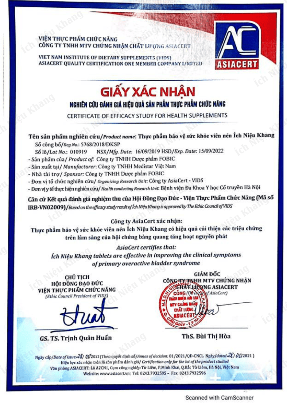 1. TPBVSK Ích Niệu Khang được sản xuất theo đúng giấy tiếp nhậnđăng ký bản công bố sản phẩm số 5768/2018/ĐKSP.
