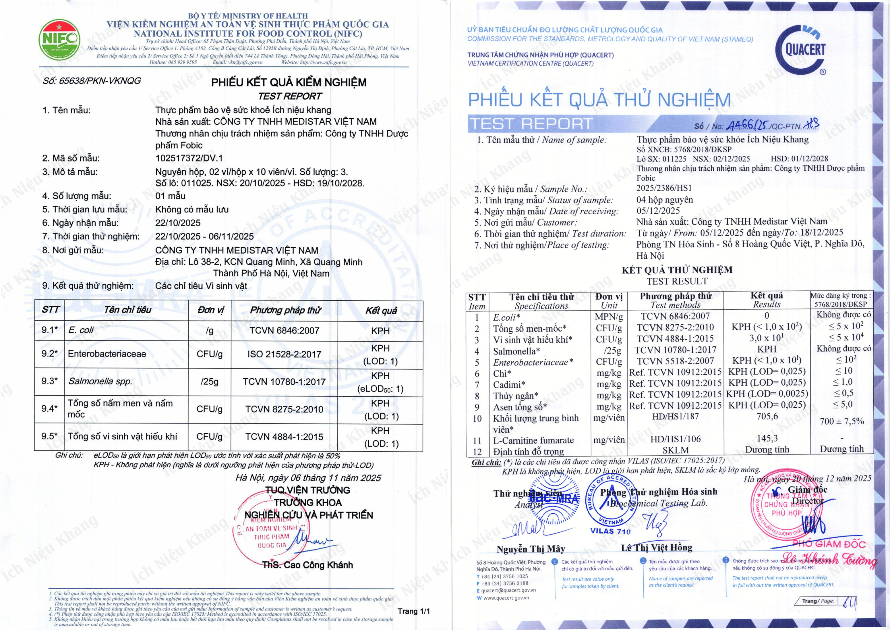 Tất cả các lô được kiểm nghiệm độc lập tại các cơ quan uy tín của Bộ y tế
